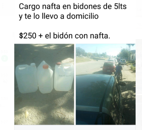 Como suele suceder, ya aparecieron los delivery de nafta quienes obviamente ofrecen sus servicios para realizar la fila y cargar combustible en bidón. Así, por 250 pesos (cada 5 litros), los automovilistas pueden ahorrarse el mal humor y encargar directamente el suministro prácticamente en la puerta de su casa.