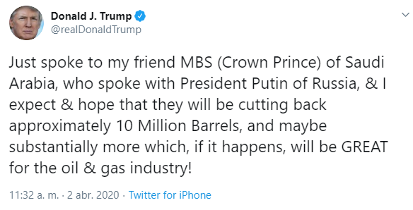 Hoy a las 11.30 de la mañana Trump escribió en su cuenta de Twitter que acaba de hablar con su «amigo MBS (Mohammed Bin Salman) el príncipe heredero de Arabia Saudita, quien habló con el presidente (Vladimir) Putin de Rusia, y espero que reduzcan aproximadamente 10 millones de barriles, y tal vez sustancialmente más, lo que si sucede será excelente para la industria del petróleo y el gas».