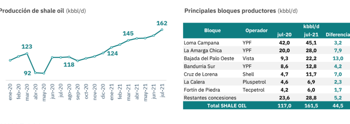 - YPF registró un alza en la producción de shale gas principalmente en el bloque Rincón del Mangrullo con 4,5 MMm3/d contra 1,7 MMm3/d de julio del 2020 (una diferencia de 2,9 MMm3/d). La empresa bandera también incrementó su producción en El Orejano y Aguada de la Arena con diferencia de 1,9 y 1,3 MMm3/d respectivamente.