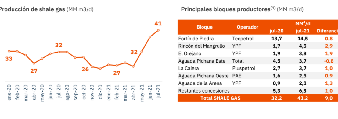 En julio del 2021 la producción de shale gas en Vaca Muerta registró un récord de 41,2 millones de metros cúbicos diarios (MMm3/d) versus los 32,2 MMm3/d de julio del 2020 y marcó una diferencia de 9 MMm3/d con un crecimiento interanual del 28%.