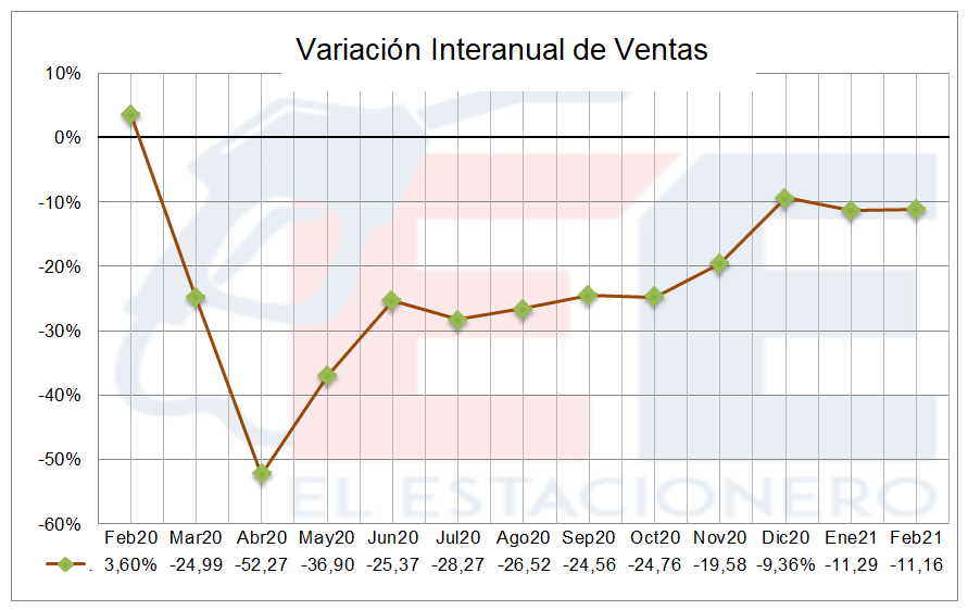 En Febrero, las ventas mantuvieron en forma casi idéntica que en enero, la diferencia interanual de volúmenes. En enero había sido de -11,29% y en febrero -11,16%. Teniendo en cuenta que estos números reflejan un movimiento turístico de verano algo deprimido, es posible que en el mes de marzo tengamos indicadores mejores. Sin embargo las nuevas restricciones a la movilidad en el corriente mes de abril, podrían hacer retroceder los indicadores.