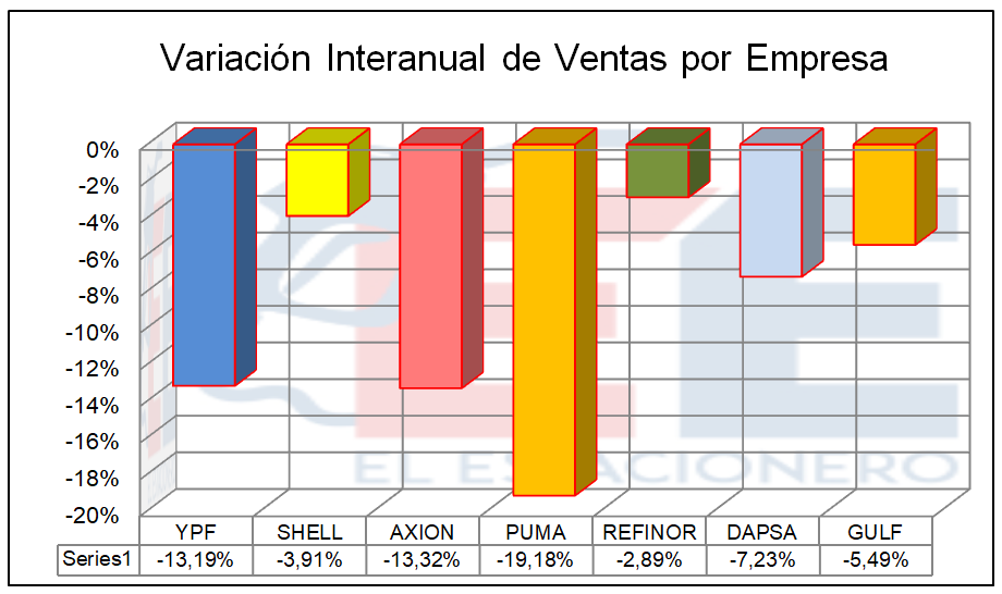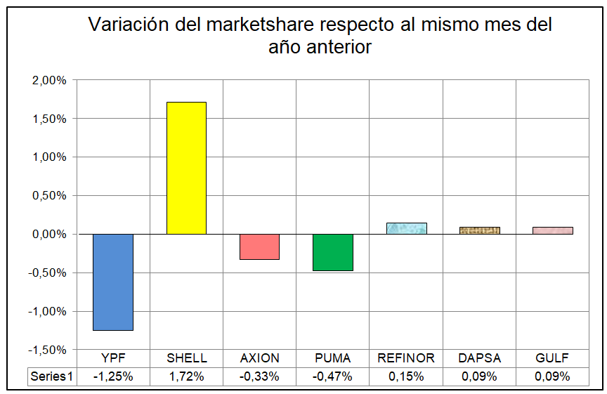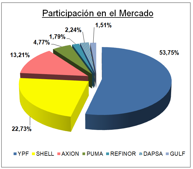 Mostramos seguidamente la participación en el mercado de las distintas empresas, YPF como de costumbre, liderando las ventas con más del 50%.