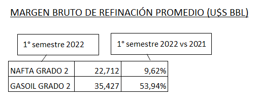 Seguidamente se aprecia el incremento en los márgenes brutos de refinación, en su comparación con los valores del año anterior. La suba es particularmente importante en el caso del gasoil grado 2, superando el 50%