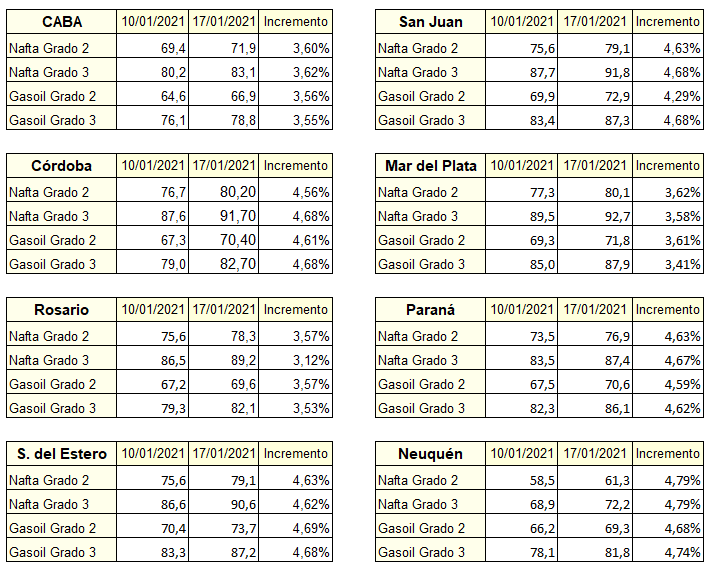 El día viernes a la 0 hora, comenzaron a regir los nuevos valores de los impuestos a los combustibles líquidos. Este ajuste tiene una incidencia de $1,241 en las naftas y $0,847 en los gasóleos, no se trasladó a los precios de venta al público ese día, sino 24 horas después. Se esperaba que el incremento final sería del orden del 2,5%, incluyendo un aumento del precio neto de los productos, pero aparentemente las conversaciones de las petroleras con la Secretaría de Energía apuntaban a un porcentaje mayor. Así es que tanto Shell como Axion y Puma anunciaron a su red abanderada el viernes a la tarde, que el incremento estaría en el orden del 5% al 6%. Se esperaba que como ocurre habitualmente, YPF hiciera la punta con el aumento para ser seguida inmediatamente por el resto de las empresas; y así ocurrió, solo que la empresa líder aumentó sus precios un 3,5% aproximadamente, mientras que las otras, tal como lo habían anunciado lo hicieron en porcentajes de hasta el 6%.