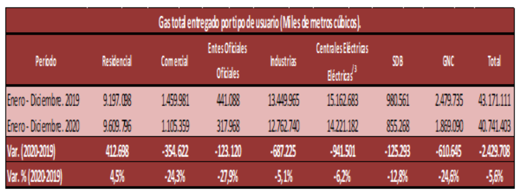 Como se observa en la tabla arriba, durante el 2020 el principal actor que traccionó la demanda de gas fue el sector residencial con un aumento del 4,5% en su consumo. Por su parte, la industria -castigada por la pandemia- bajó 5,1% dicha demanda en el mismo año.
