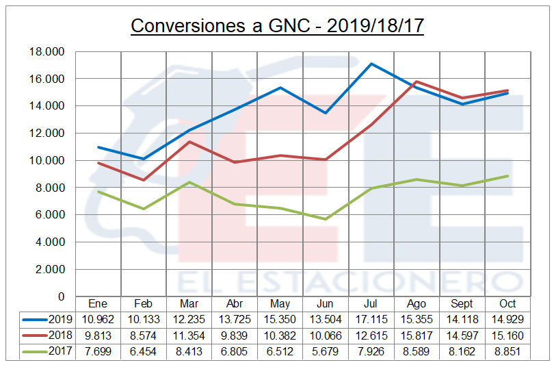 Esta situación se vio reflejada en un fuerte aumento en las conversiones de vehículos que se ubicó en el orden del 60% con respecto al año 2017. Durante el año en curso, hasta el mes de julio, el crecimiento de las conversiones siguió en aumento; sin embargo en el mes agosto se volvió a los niveles del 2018, coincidiendo exactamente con el congelamiento en los precios de las naftas. De allí en adelante la cantidad de conversiones fue muy similar a la del año anterior, llegando en el mes de octubre, prácticamente a igualarse.