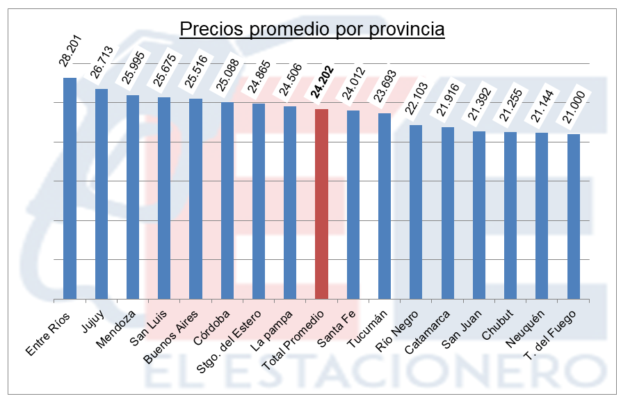 A comienzos del mes en curso, los precios en cada provincia del país, eran los que se muestran a continuación, siendo el precio promedio a nivel país, de $24,20.