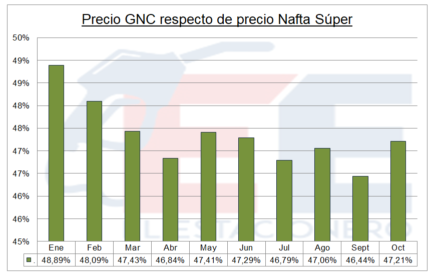 ¿Qué porcentaje sobre el precio de la nafta súper representa el valor del GNC? Durante lo que va del año las variaciones no han sido demasiado significativas, ubicándose siempre por debajo del 50%