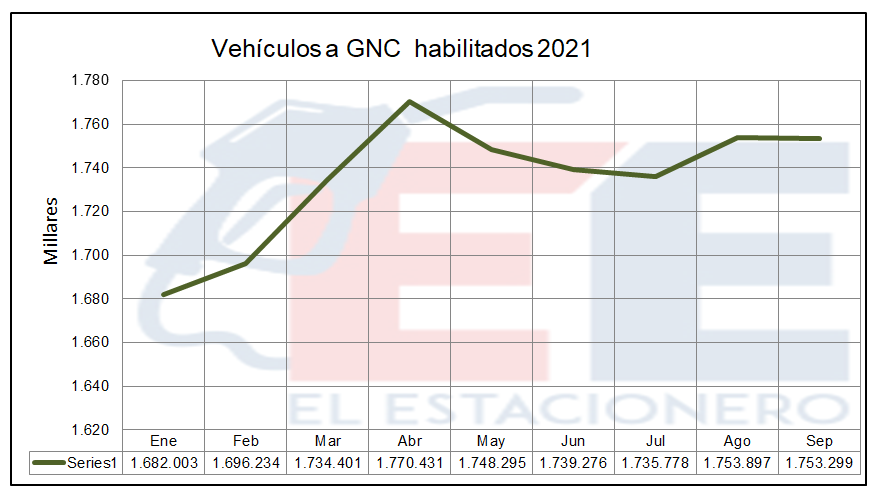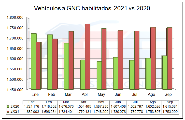 La evolución de la cantidad de vehículos a GNC en los primeros nueve meses del año y su comparación interanual, es la siguiente