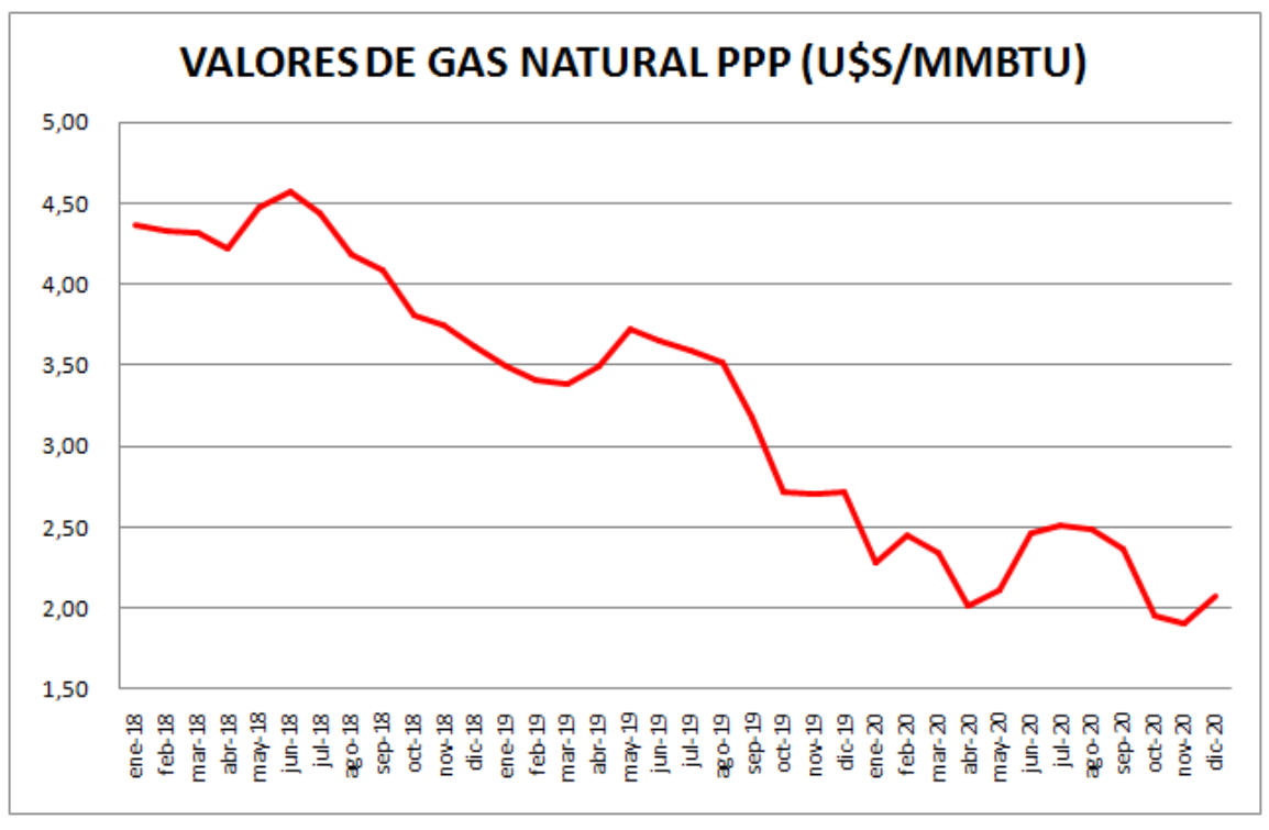 Diciembre de 2020 muestra una incipiente recuperación de precios promedio que llegan a 2,08 dólares por millón de BTU, un 9,47% por encima de los valores de noviembre.