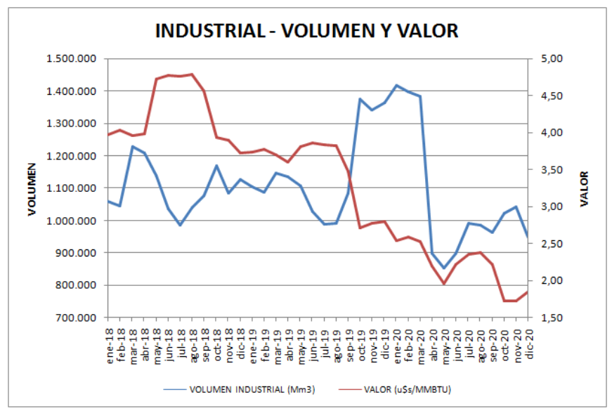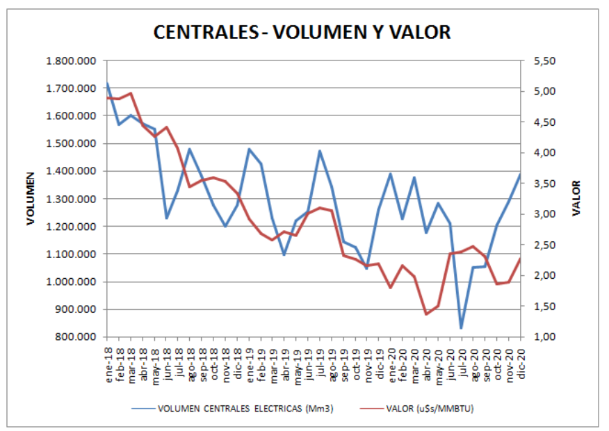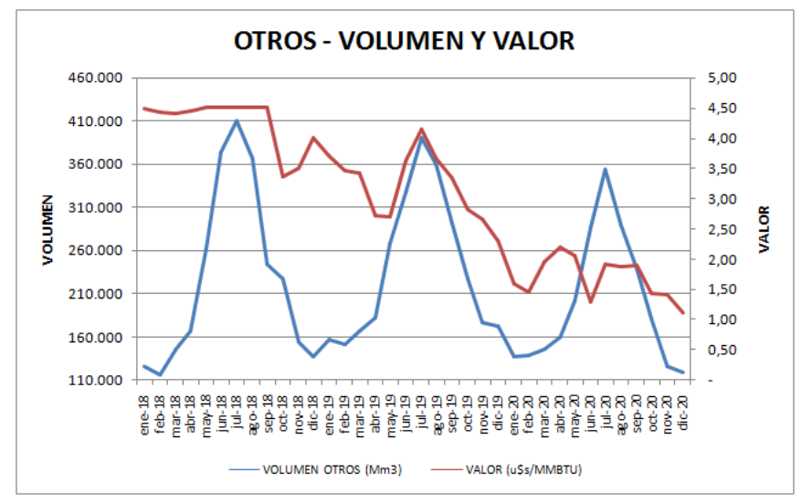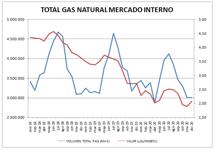 El volumen promedio del período (2018-2020) fue de 41,45 MMm3/día y el precio fue descendiendo en forma importante desde casi 5,0 u$s/MMBTU hasta 1,9 u$s/MMBTU,