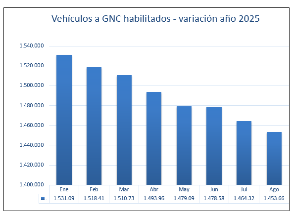La disminución del parque automotor propulsado por GNC, se observa en forma permanente, mes a mes en lo que va del año.