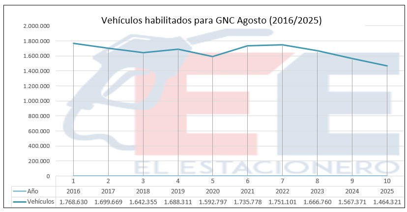 La disminución del parque automotor propulsado por GNC, se observa en forma permanente, mes a mes en lo que va del año.