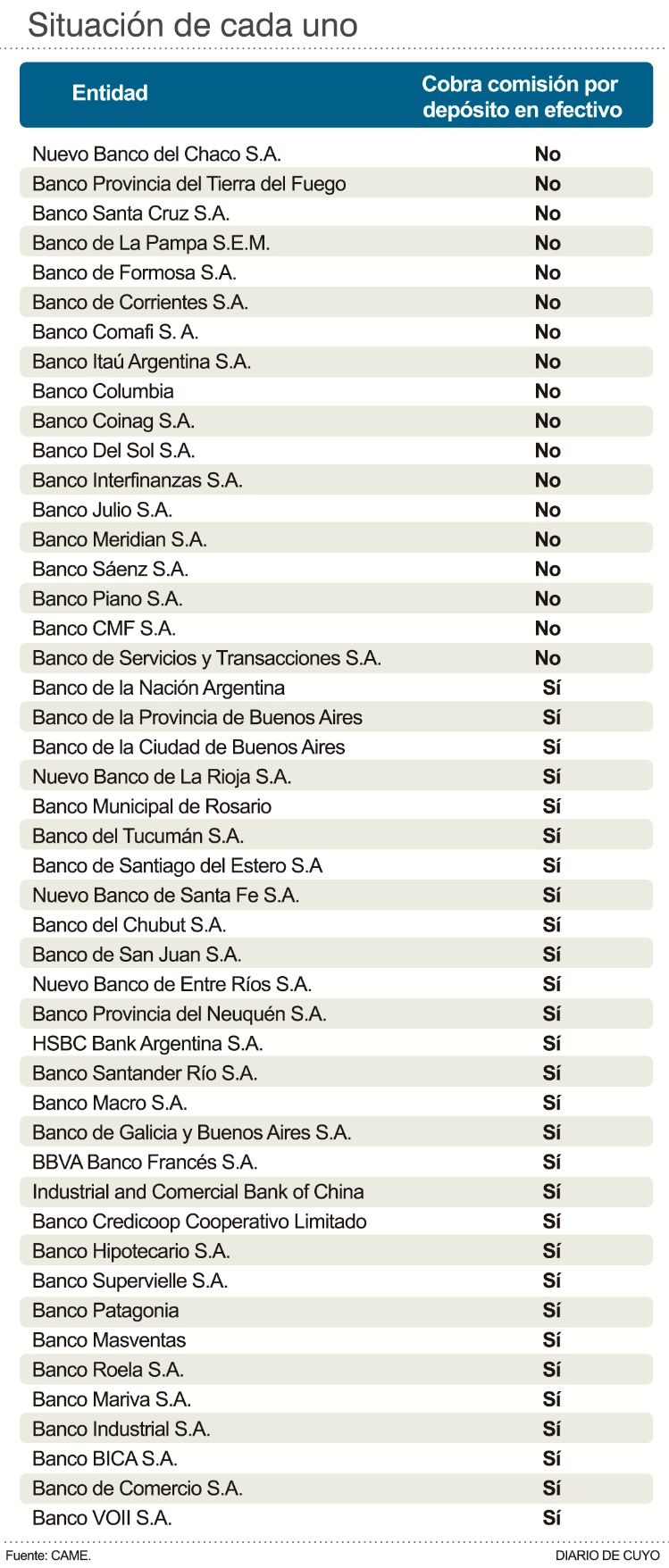 La CAME elaboró un listado de los bancos en el país que cobran esta comisión y los que no lo hacen (ver infografía) en base a un relevamiento en las entidades crediticias. Cabe aclarar que algunas no lo hacían, aunque desde enero se ha comenzado a generalizar la metodología.