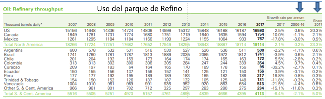 En Argentina hace 38 años que no se inaugura una nueva refinería por el déficit de estabilidad y la falta de inversiones de largo plazo. En estos 38 años el parque automotor ha crecido exponencialmente. Como vemos en el informe que presenta el informe de British Petroleum en su informe anual del 2018 la argentina está estancada en 500 mil barriles de petróleo por día en su capacidad de procesamiento.