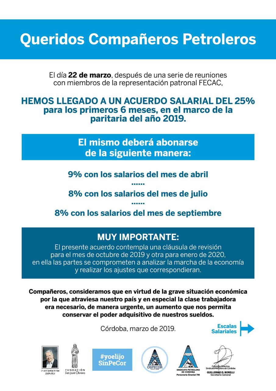 FECAC y el Sindicato Petrolero de Córdoba, firmaron el viernes un acuerdo salarial para el año en curso, con ámbito de aplicación en la provincia de Córdoba. La firma de la nueva escala fue sorpresiva ya que se esperaba una negociación más prolongada. Se trata de un acuerdo abierto, ya que establece revisiones en los meses de octubre del corriente año y enero del 2020.