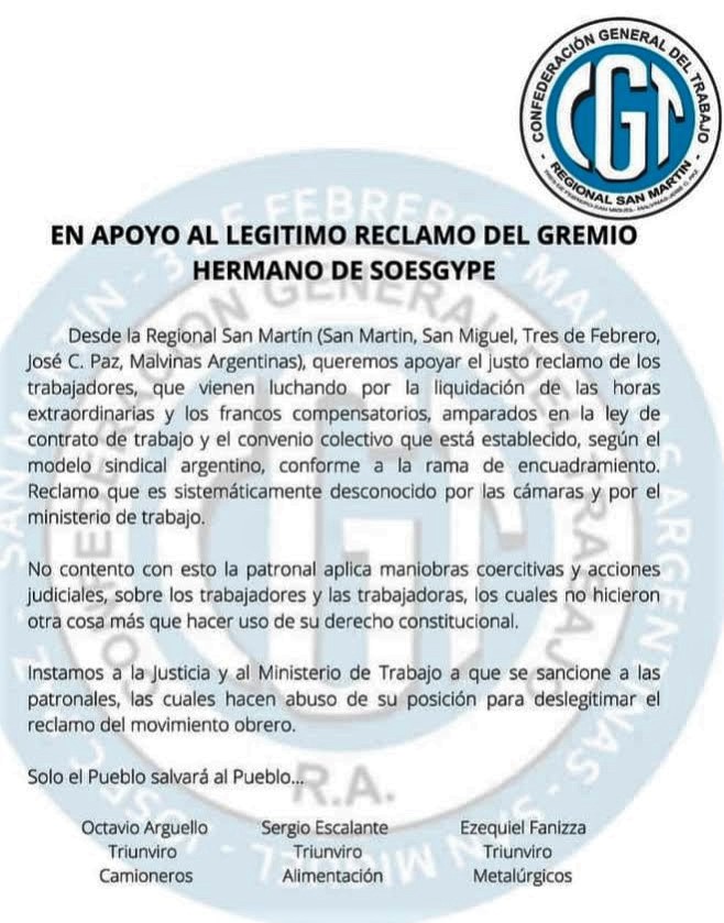 Las diferentes regionales de la Central Obrera manifestaron sendos mensajes de acompañamiento y solidaridad con la lucha del SOESGYPE que encabeza Carlos Acuña, para lograr el cumplimiento de los pagos de las horas extraordinarias y francos compensatorios.
