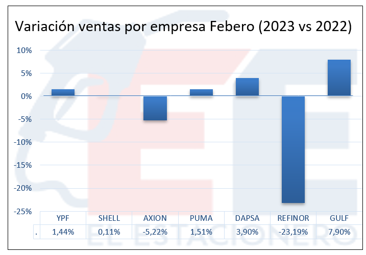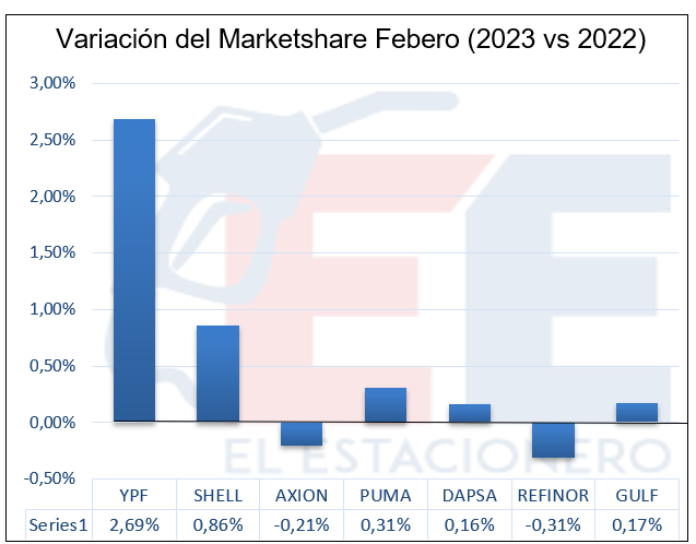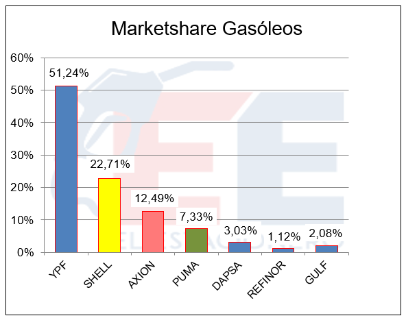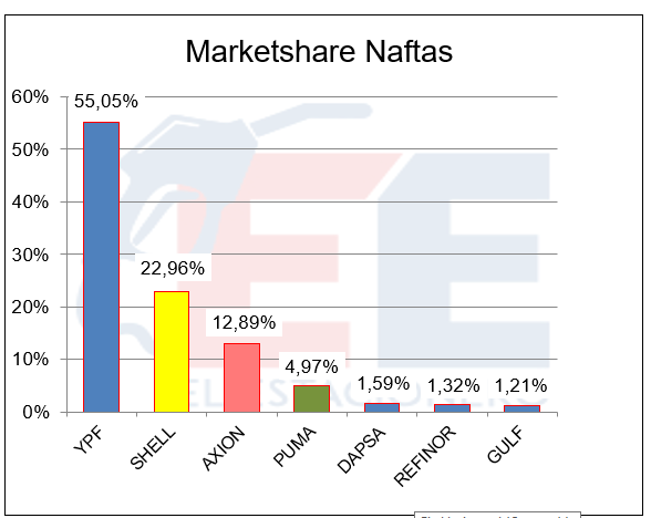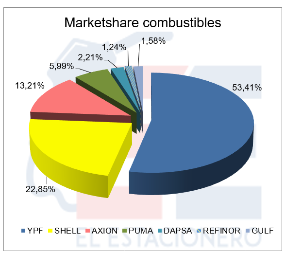 En cuanto a la participación en el mercado de cada empresa, YPF alcanzó el 53,41% (ventas en estaciones de servicio), ubicándose así en primer lugar en incremento de su marketshare.
